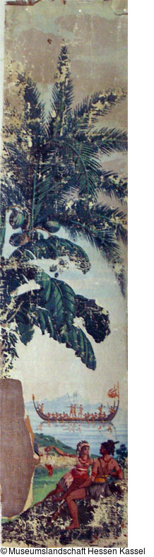 Die Panoramatapete bietet dem Betrachter auf insgesamt zwanzig Bahnen eine Schau von vierzehn pazifischen Inseln an, die ein bereits durch Jean-Jacques Rousseau im 18. Jahrhundert geprägtes Idealbild des ›Guten Wilden‹ im Paradies vermitteln. Dieser fischt, pflückt Früchte vom Baum, tanzt, ist in prächtige Gewänder gekleidet oder trägt – in antikisch geprägtem Muster – sportliche Wettkämpfe aus. Die positiven Versatzstücke wurden aus Reisebeschreibungen oder Bildquellen entsprechend den Regeln der ›bienséance‹ herausgefiltert und mit akademisch geschulten Kompositions- und Farbschemata einer Theaterstaffage gleich zusammengesetzt. Negatives wie Menschenfresserei in Neuseeland, Nacktheit und Tätowierungen – Ausdruck einer sozialen Hierarchie – ebenso wie der Tod des Kapitän Cook auf Hawai werden nicht dargestellt oder nur angedeutet; die im Bild zensierten Aspekte werden allein in einer heute noch erhaltene achtundvierzig Seiten umfassende Verkaufsbroschüre der Manufaktur Dufour, mit der diese 1804/1805 die Bildtapete Les sauvages bewarb. Sie liefert nicht nur wichtige Hinweise zur Genese der Tapete, sondern beschreibt darüber hinaus die Möglichkeiten ihrer Rezeption aus der Verkäuferperspektive heraus. Die von Dufour in seiner Verkaufsbroschüre besonders hervorgehobene Bildungsfunktion wird – neben der ästhetischen Dimension – die wichtigste Funktion der Bildtapete gewesen sein. Es entstand so ein noch in der Tradition des idyllischen Landschaftszimmers stehendes Interieur, das sich bereits im 18. Jahrhundert einer großen Beliebtheit erfreute. Einen neuen Akzent dieser Gattung sollte fünfundzwanzig Jahre später Jean Zuber mit der Herausgabe der Panoramatapete Les Vues du Brésil (1829/30) setzen, deren Politisierung mit Szenen wie etwa der ›Überfall der Weißen auf die Indianer‹ neuartig war.