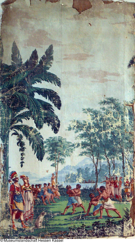 Die Panoramatapete bietet dem Betrachter auf insgesamt zwanzig Bahnen eine Schau von vierzehn pazifischen Inseln an, die ein bereits durch Jean-Jacques Rousseau im 18. Jahrhundert geprägtes Idealbild des ›Guten Wilden‹ im Paradies vermitteln. Dieser fischt, pflückt Früchte vom Baum, tanzt, ist in prächtige Gewänder gekleidet oder trägt – in antikisch geprägtem Muster – sportliche Wettkämpfe aus. Die positiven Versatzstücke wurden aus Reisebeschreibungen oder Bildquellen entsprechend den Regeln der ›bienséance‹ herausgefiltert und mit akademisch geschulten Kompositions- und Farbschemata einer Theaterstaffage gleich zusammengesetzt. Negatives wie Menschenfresserei in Neuseeland, Nacktheit und Tätowierungen – Ausdruck einer sozialen Hierarchie – ebenso wie der Tod des Kapitän Cook auf Hawai werden nicht dargestellt oder nur angedeutet; die im Bild zensierten Aspekte werden allein in einer heute noch erhaltene achtundvierzig Seiten umfassende Verkaufsbroschüre der Manufaktur Dufour, mit der diese 1804/1805 die Bildtapete Les sauvages bewarb. Sie liefert nicht nur wichtige Hinweise zur Genese der Tapete, sondern beschreibt darüber hinaus die Möglichkeiten ihrer Rezeption aus der Verkäuferperspektive heraus. Die von Dufour in seiner Verkaufsbroschüre besonders hervorgehobene Bildungsfunktion wird – neben der ästhetischen Dimension – die wichtigste Funktion der Bildtapete gewesen sein. Es entstand so ein noch in der Tradition des idyllischen Landschaftszimmers stehendes Interieur, das sich bereits im 18. Jahrhundert einer großen Beliebtheit erfreute. Einen neuen Akzent dieser Gattung sollte fünfundzwanzig Jahre später Jean Zuber mit der Herausgabe der Panoramatapete Les Vues du Brésil (1829/30) setzen, deren Politisierung mit Szenen wie etwa der ›Überfall der Weißen auf die Indianer‹ neuartig war.