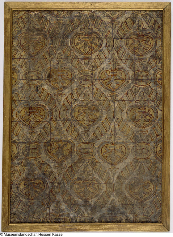 Fond: Goldleder Strichelpunzen Motiv: mit heute rotem Lüster konturiert, Perlpunzen |