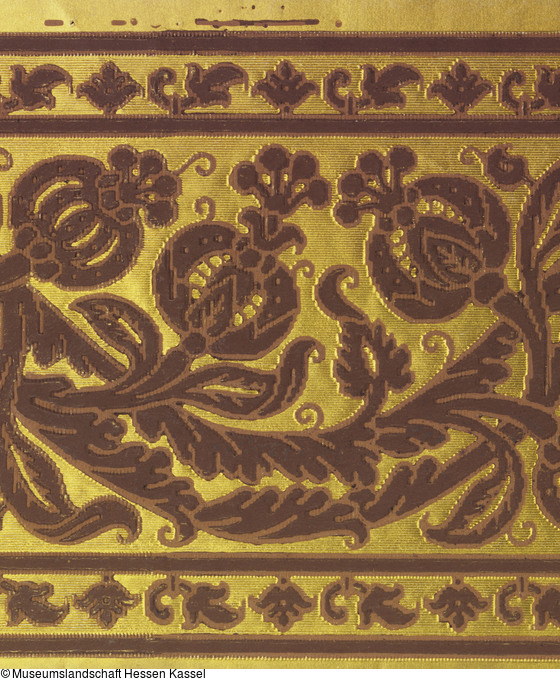 Bezeichnung: Papierbordüre mit Imitation eines Reliefsamtes auf goldenem Grund