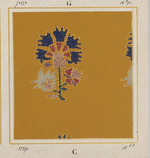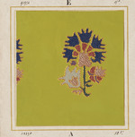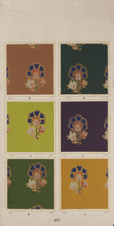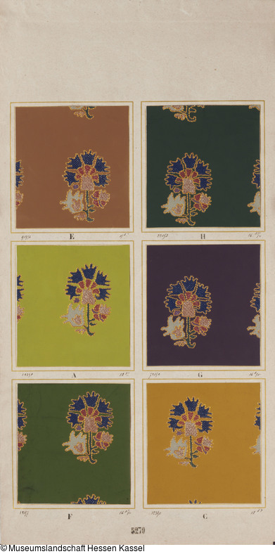 Bezeichnung: Papiertapete mit Imitation einer Applikationsstickerei mit Laméfäden, Musterblatt mit sechs Farbstellungen