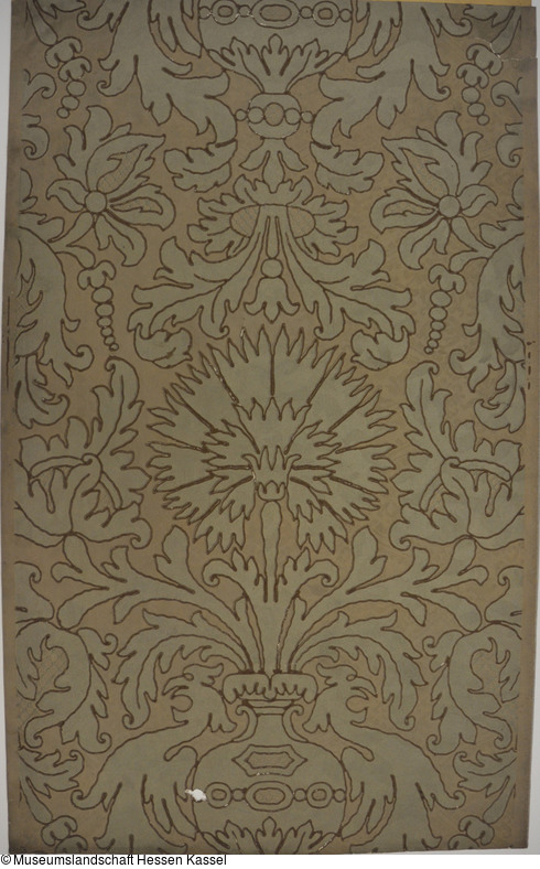 Katalogtext: »Exécuté dans la manufacture de P. Balin d´après une étoffe de soie brodée en application du XVIᵉ siècle (Renaissance Italienne) (Collection Paul Balin) N° d´ordre et marque de fabrique: 5258 P.B.«