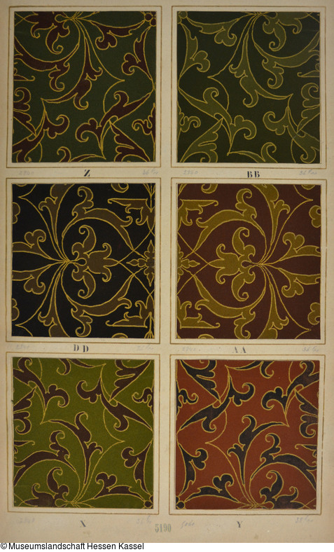 Papiertapete mit Imitation einer Applikationsstickerei zweier unterschiedlicher Samtgewebe, Musterblatt mit sechs Farbstellungen