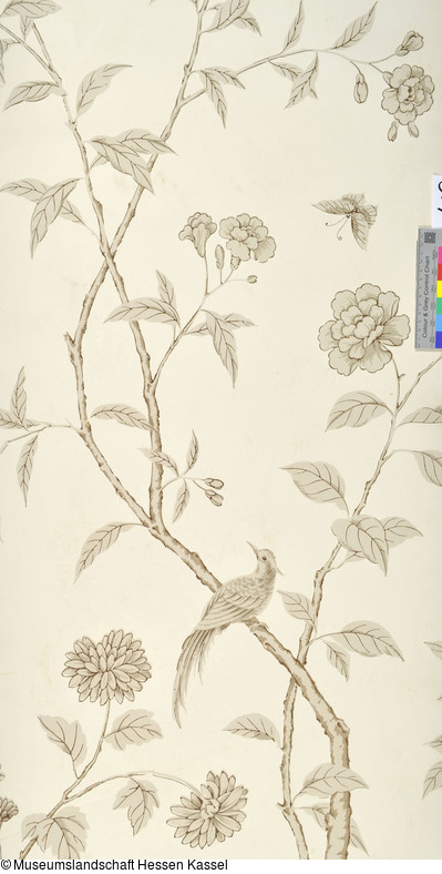 L DTM 429 a: Tapete, Blumen und Vögel in Gold auf Blau, "Dekor Wilhelmsthal Homburg", asiatisch