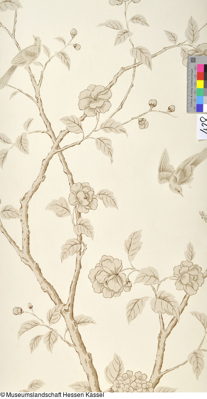 L DTM 429 a: Tapete, Blumen und Vögel in Gold auf Blau, "Dekor Wilhelmsthal Homburg", asiatisch