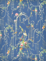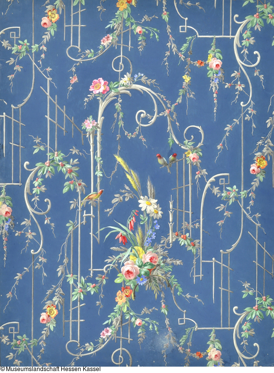 Entwurf, mit Rankgittern aus Akanthusvoluten en grisaille und Blumendekor aus Margeriten, Rosen, Vergissmeinnicht, roten Beeren und Kornähren sowie verschiedenen Vögeln