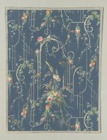 Entwurf, mit Rankgittern aus Akanthusvoluten en grisaille und Blumendekor aus Margeriten, Rosen, Vergissmeinnicht, roten Beeren und Kornähren sowie verschiedenen Vögeln |