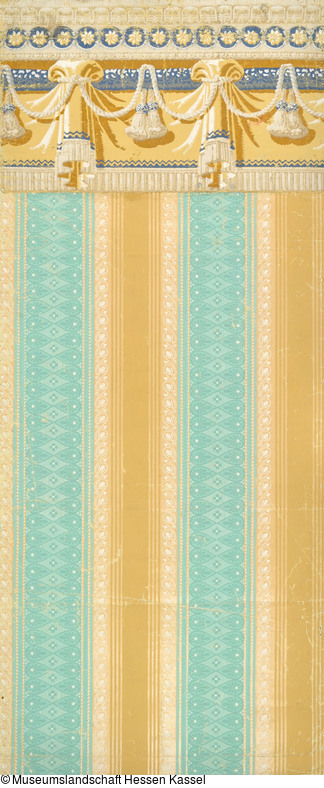 Rapporttapete mit Pflanzendekor in Bändern dazu Draperiebordüre |