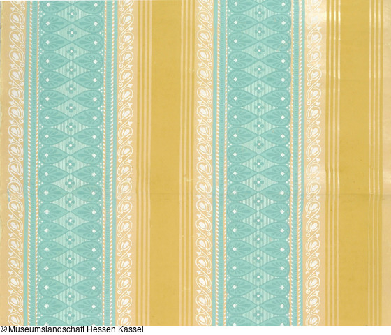 Tapete, ornamentale Streifen in Türkis und Weiß auf Beige. Kat.Nr. 47 (Arnold-Katalog) |