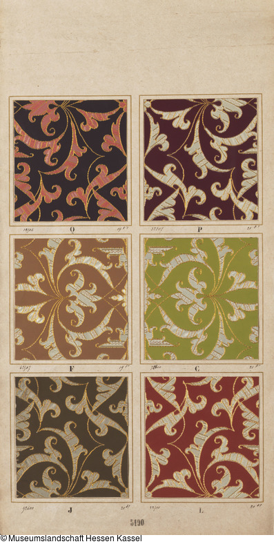 5. L DTM T 445 a: Papiertapete mit Imitation einer Applikationsstickerei zweier unterschiedlicher Samtgewebe, Musterblatt mit sechs Farbstellungen