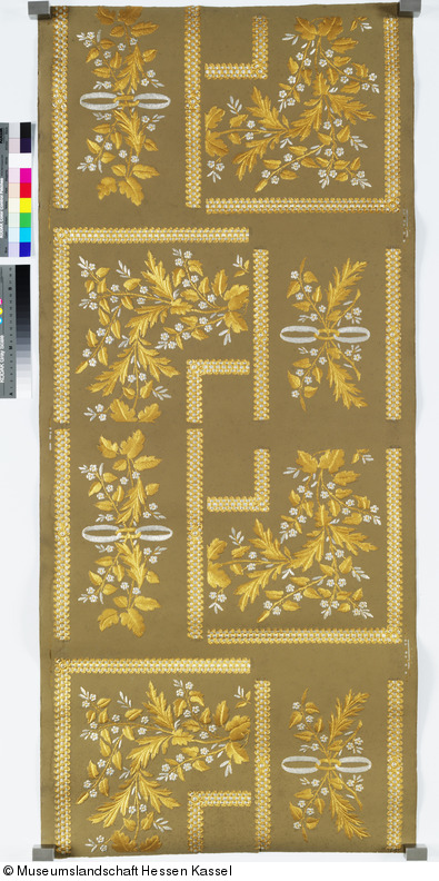 Mittel- und Eckstücke aus dem Dekor "Louis XV" mit Imitation von Metallstickerei mit Gold- und Silberfäden