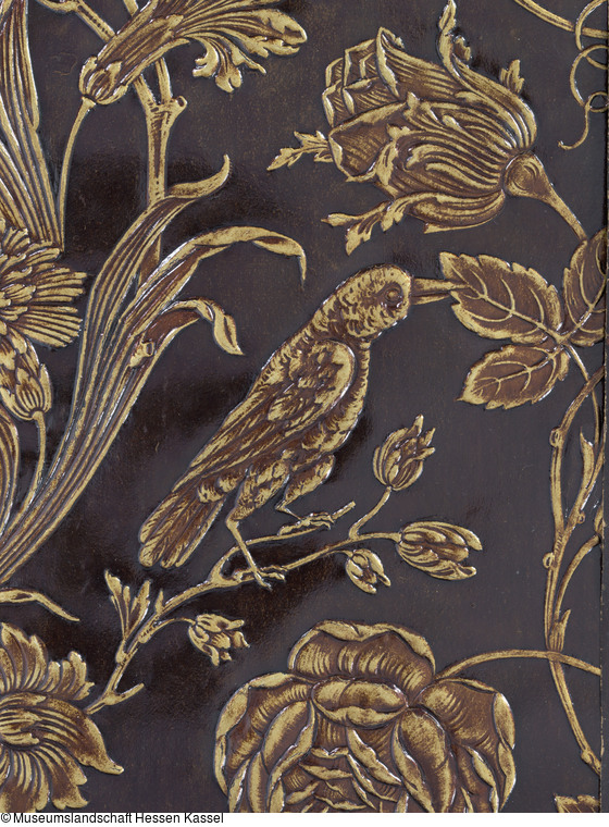 Bezeichnung: Tapete, Lederimitat, Wein- und Blumenranken in Gold auf Schwarz