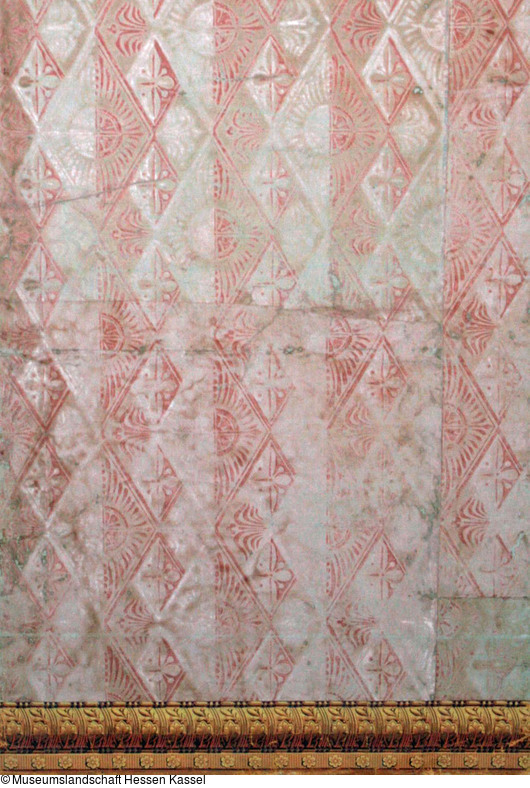 Papier; Handdruck auf Bogenpapier; Tapete: zwei Farben auf gestrichenem Fond; Bordüren: fünf Farben auf gestrichenem Fond und drei Velourstöne der oberen Bordüre