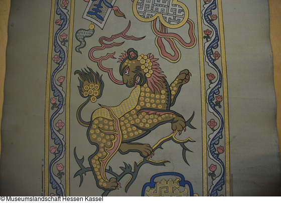 Bezeichnung: Papierbordüre mit Imitation eines Seidengewebes mit chinoisem Motiv