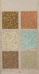 L DTM T 423 b: Papiertapete mit Imitation einer Goldstickerei auf unterschiedlichen Geweben mit eingewebtem Metalllahn, Musterblatt mit sechs Farbstellungen