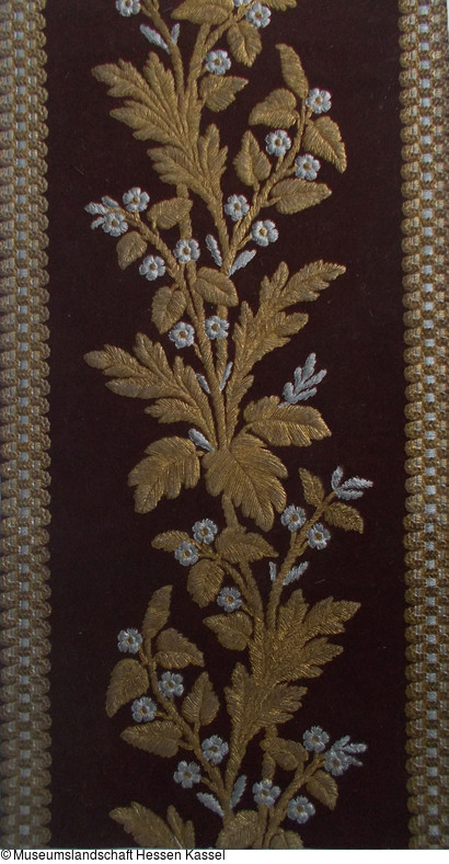L DTM D 33 a-c: Mittel- und Eckstücke aus dem Dekor "Louis XV" mit Imitation von Metallstickerei mit Gold- und Silberfäden