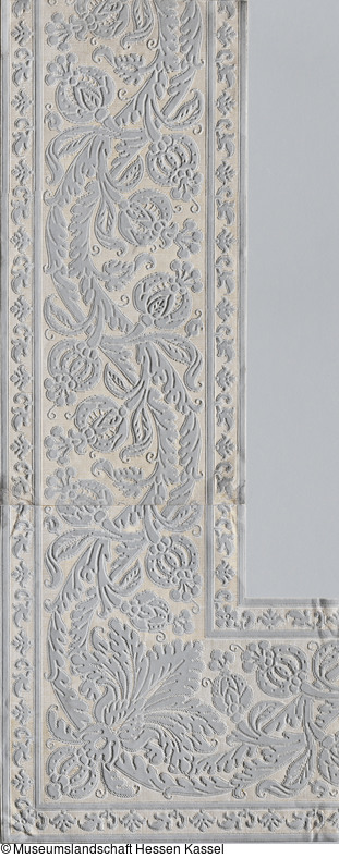 Bezeichnung: Eckstück einer Bordüre mit Imitation eines Reliefsamtes mit goldenen Laméfäden