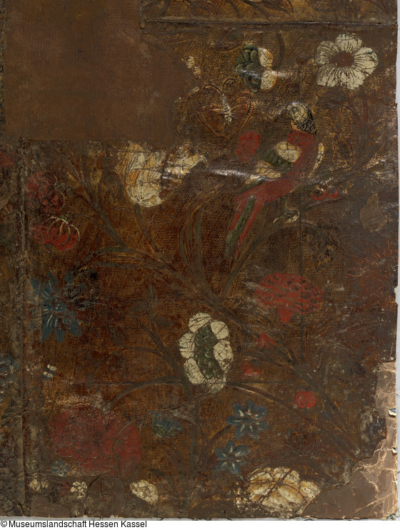 Goldledertapete mit Papageien zwischen Blumenranken |